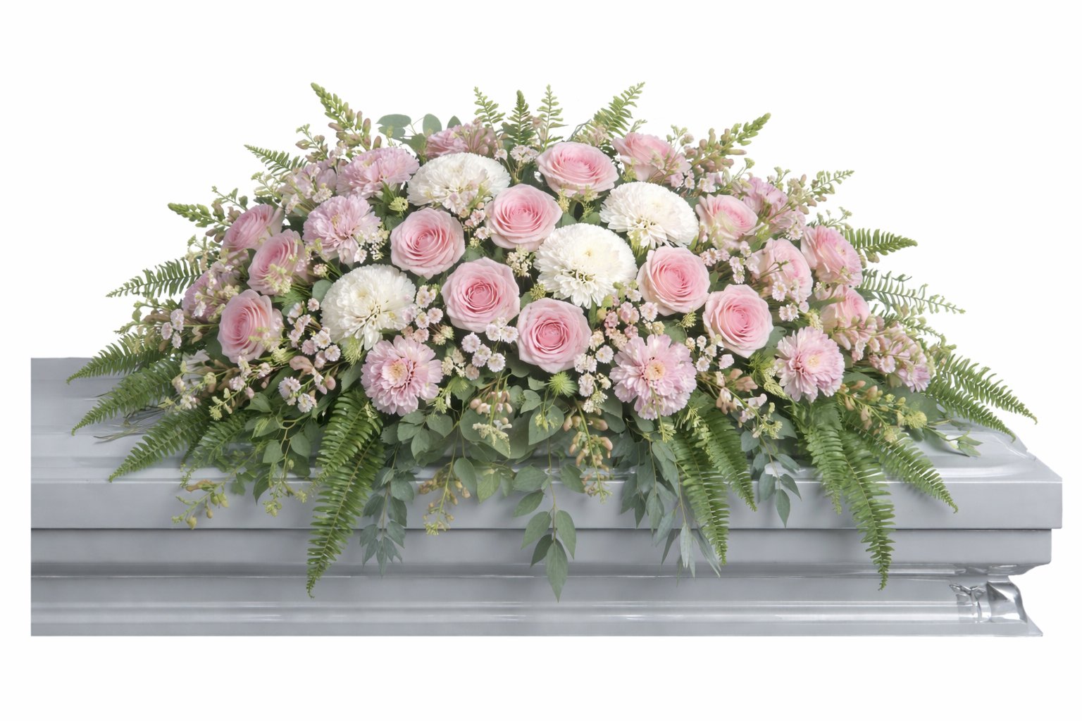 A full and elegant top coffin spray in soft pink and white tones, made with local roses, chrysanthemums, carnations, seasonal fillers, and flowing greenery, designed to cover the top length of the coffin.