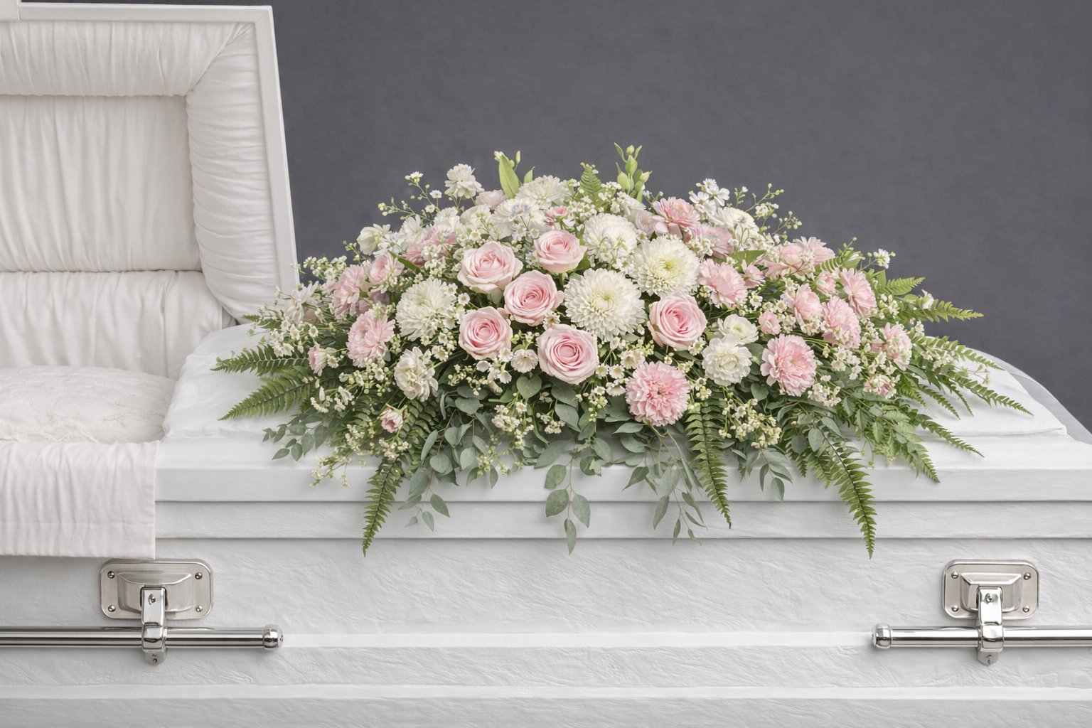 This coffin spray is designed to rest across the entire top of the coffin, creating a lush and dignified floral tribute for funeral services and viewing. Styled in soft pink and white tones, it offers a gentle, comforting presence and a classic farewell arrangement.