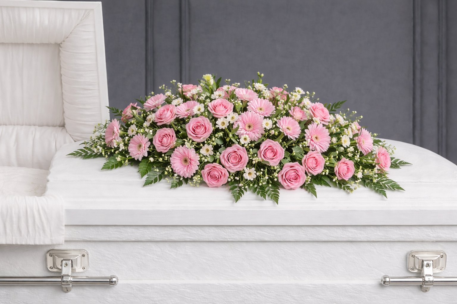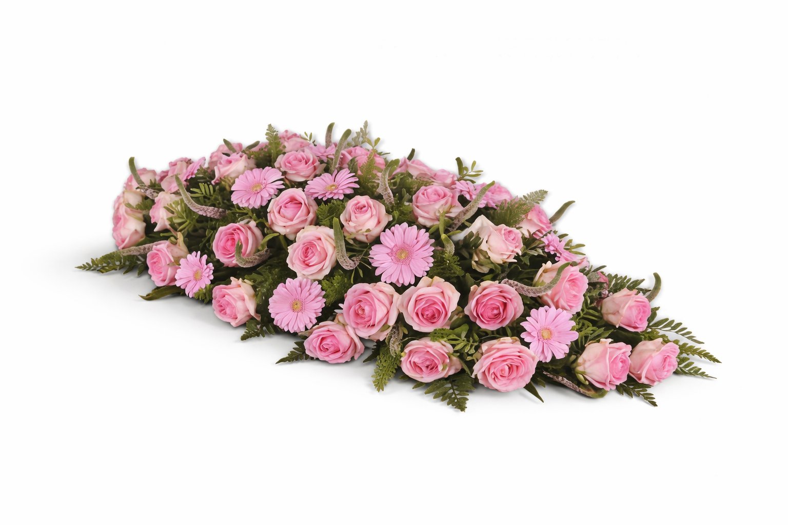 This arrangement includes a carefully balanced mix of pink roses, pink gerbera daisies, seasonal filler flowers, and flowing foliage for a natural garden-style finish. The overall look is soft, feminine, and serene, with a shape that sits neatly on the coffin lid.