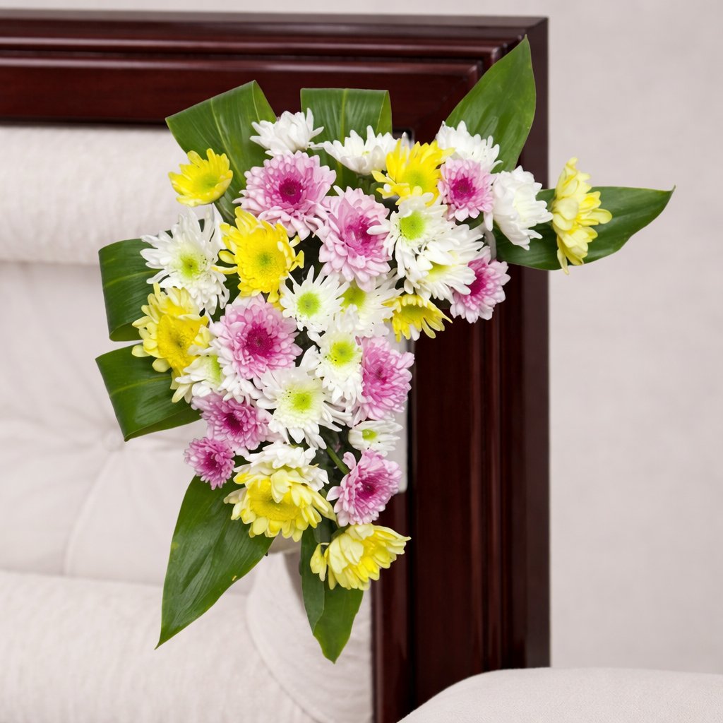 This bright and comforting casket flower set features yellow, white, and violet tones, arranged with mixed chrysanthemums and fresh greenery to honour a life with warmth and remembrance.