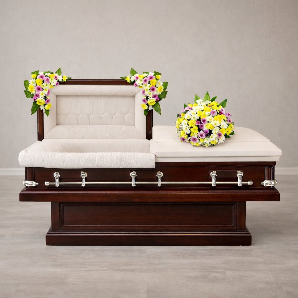 This casket flower set is designed as a complete and coordinated tribute, featuring a matching round arrangement and two side garlands to decorate the coffin with a balanced, respectful, and uplifting look. With its cheerful yellow, clean white, and soft violet tones, it offers a warm farewell while remaining appropriate and elegant for funeral services and viewing.