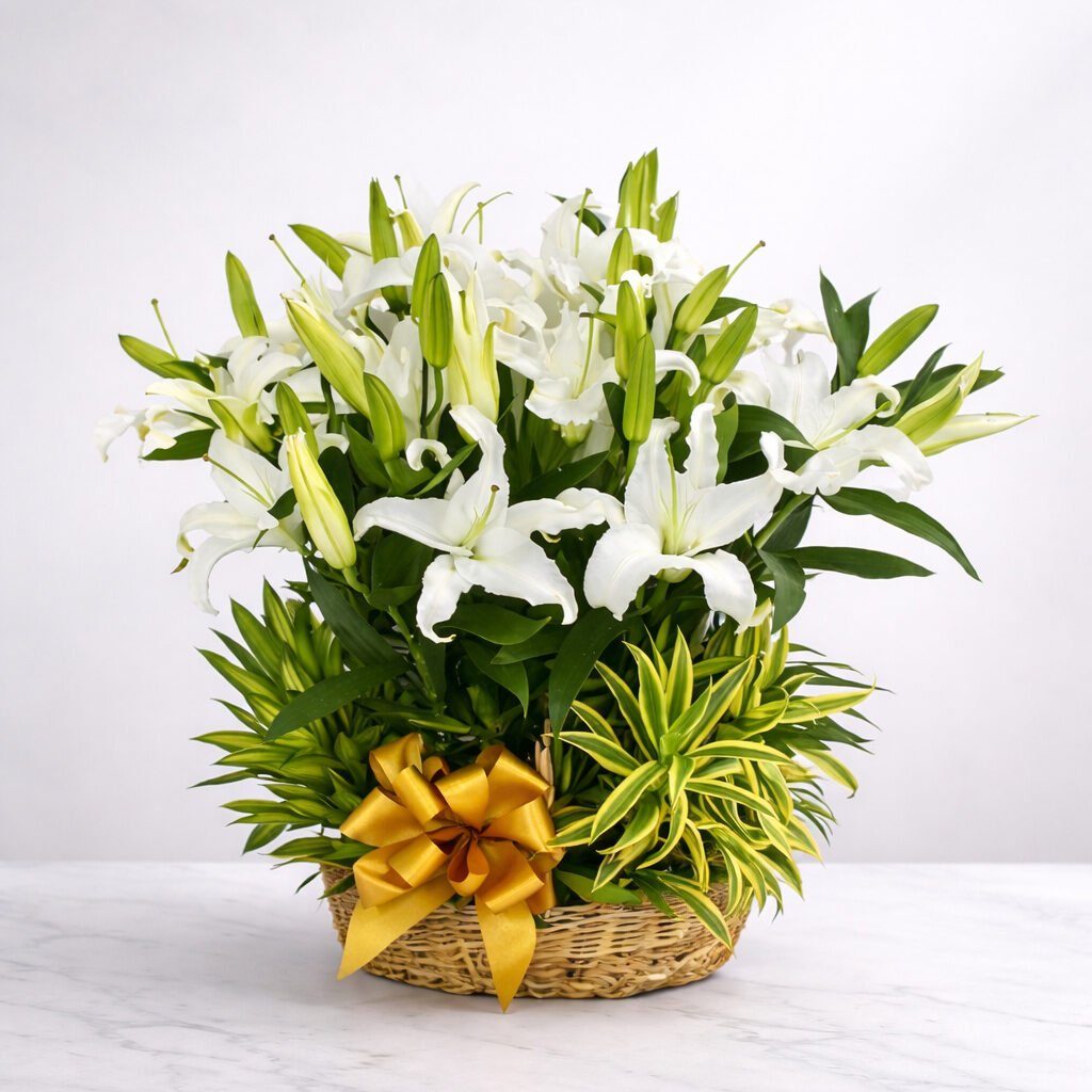 This basket arrangement is designed as a clean and graceful floral tribute for funeral services, wakes, and memorial gatherings. Featuring Casablanca lilies in a full, airy presentation, it offers a calm and respectful display, arranged with fresh greenery and finished with a ribbon accent in a classic basket base.