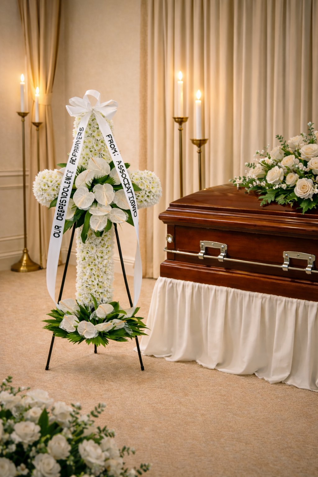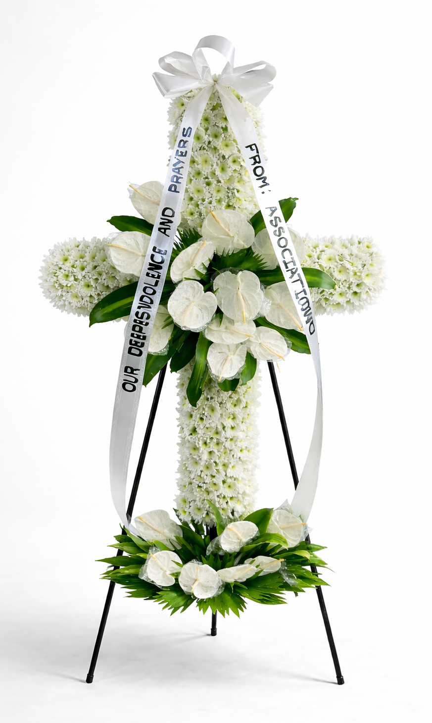 White funeral cross flowers arranged as a standing tribute